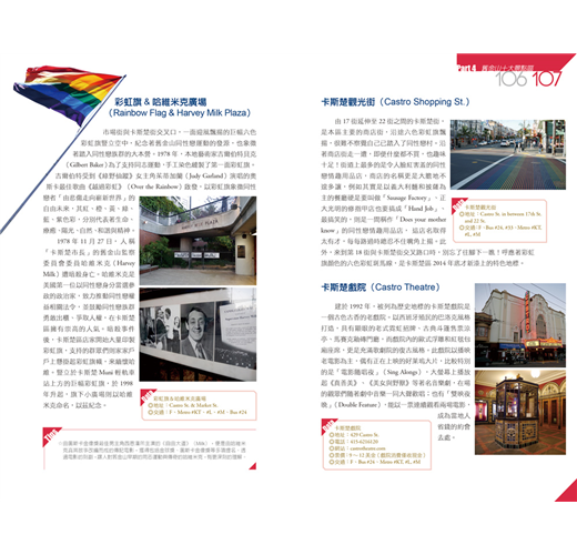彩虹旗& 哈維米克廣場/卡斯楚觀光街/卡斯楚戲院/巴米巷壁畫/克萊里恩巷壁畫/仕女大樓/杜樂莉絲公園/利蒙秘魯烤肉/坎昆墨西哥餐點鋪/哈維紀念餐廳/船錨生蠔吧/ Orenchi Beyond / Kitchen Story