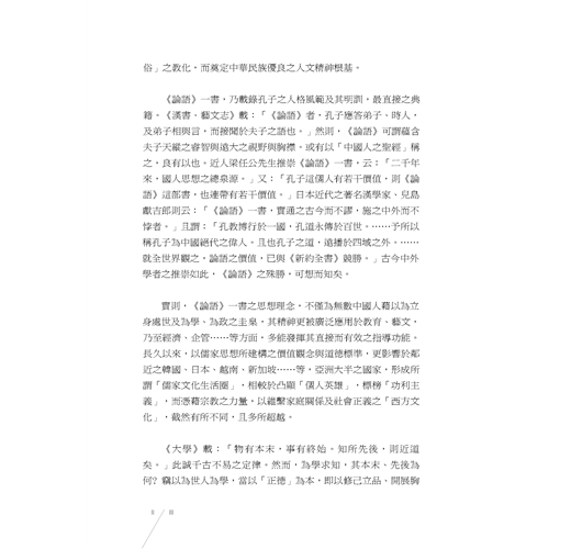 《論語》一書,乃載錄孔子之人格風範及其明訓,最直接之典籍。《漢書.藝文志》載:「《論語》者,孔子應答弟子、時人,及弟子相與言,而接聞於夫子之語也。」然則,《論語》可謂蘊含夫子天縱之睿智與遠大之視野與胸襟。或有以「中國人之聖經」稱之,良有以也。近人梁任公先生推崇《論語》一書,云:「二千年來,國人思想之總泉源。」又:「孔子這個人有若干價值,則《論語》這部書,也連帶有若干價值。」日本近代之著名漢學家、兒島獻吉郎則云:「《論語》一書,實通之古今而不謬,施之中外而不悖者。」且謂:「孔教博行於一國,孔道永傳於百世。⋯⋯予所以稱孔子為中國絕代之偉人。且也孔子之道,遠播於四域之外。⋯⋯就全世界觀之,論語之價值,已與《新約全書》競勝。」古今中外學者之推崇如此,《論語》之殊勝,可想而知矣。