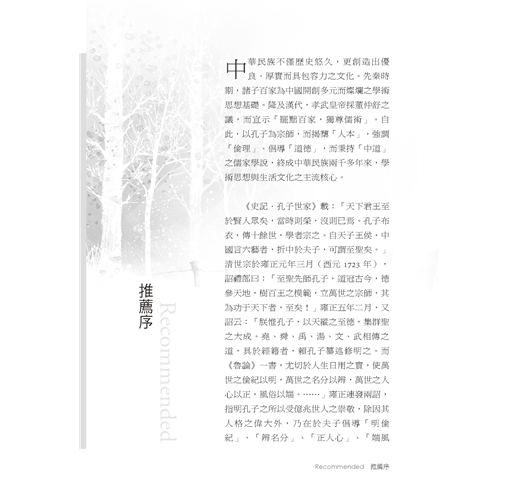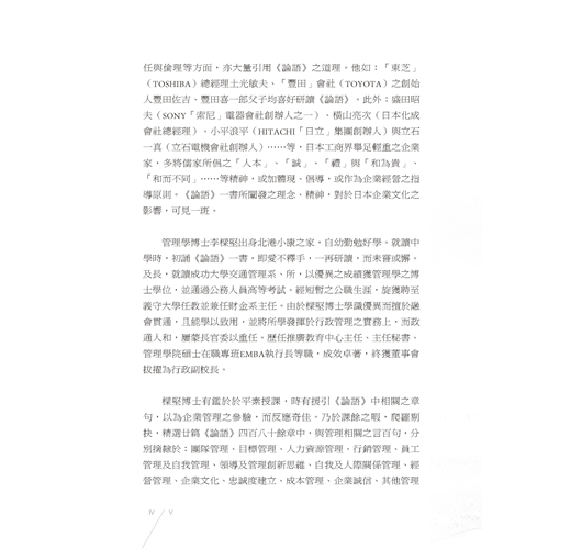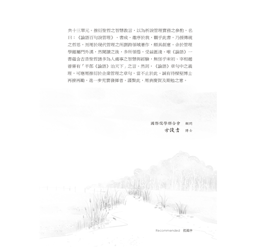 樑堅博士有鑑於於平素授課,時有援引《論語》中相關之章句,以為企業管理之參驗,而反應奇佳。乃於課餘之暇,爬羅剔抉,精選廿篇《論語》四百八十餘章中,與管理相關之言百句,分別摘隸於:團隊管理、目標管理、人力資源管理、行銷管理、員工管理及自我管理、領導及管理創新思維、自我及人際關係管理、經營管理、企業文化、忠誠度建立、成本管理、企業誠信、其他管理共十三單元。推衍聖哲之智慧教言,以為析說管理實務之參酌,名曰:《論語百句說管理》。書成,邀序於我,觀乎此書,乃援傳統之哲思,而用於現代管理之所謂跨領域著作,頗具創意。余於管理學雖屬門外漢,然閱讀之後,多所領悟,受益匪淺。唯《論語》一書蘊含古昔聖哲諸多為人處事之智慧與經驗,無怪乎宋初、宰相趙普嘗有「半部《論語》治天下」之言。然則,《論語》章句中之義理,可應用推衍於企業管理之章句,當不止於此。誠有待樑堅博士再接再勵,進一步充實發揮者。謹贅此,用表慶賀及期勉之意。
