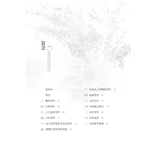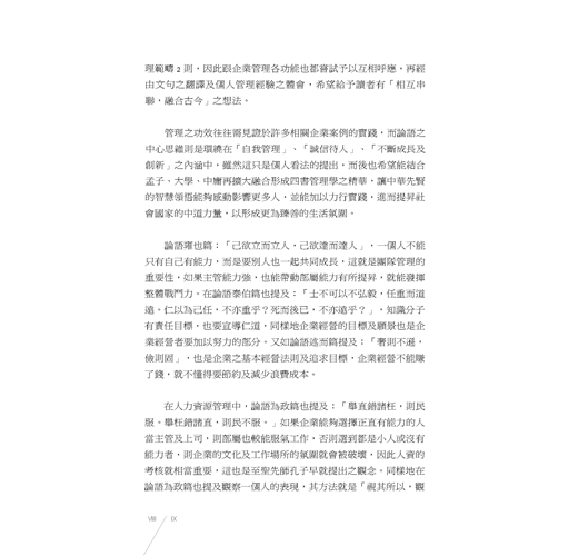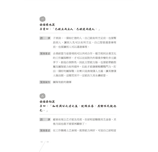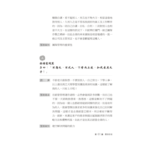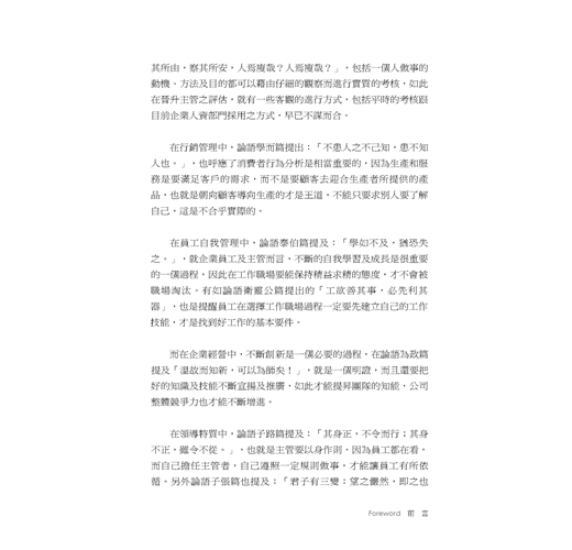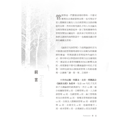 本書均以魏‧何晏注、北宋‧邢隅疏之《論語注疏》為底本,包含100 句孔子及其弟子主講論語的經典語句,共分13篇,區分有團隊管理3則、目標管理2則、人力資源管理15則、行銷管理3則、員工管理教育及自我管理22則、領導及管理創新思維13則、自我及人際關係管理22則、經營管理10則、企業文化4則、忠誠度建立1則、成本管理1則、企業誠信2則及其他管理範疇2則,因此跟企業管理各功能也都嘗試予以互相呼應,再經由文句之翻譯及個人管理經驗之體會,希望給予讀者有「相互串聯,融合古今」之想法。