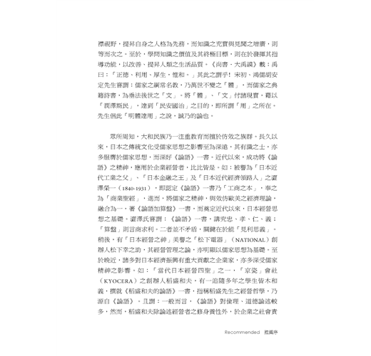 眾所周知,大和民族乃一注重教育而擅於仿效之族群。長久以來,日本之傳統文化受儒家思想之影響至為深遠,其有識之士,亦多服膺於儒家思想,而深好《論語》一書。近代以來,成功將《論語》之精神,應用於企業經營者,比比皆是。如:被譽為「日本近代工業之父」、「日本金融之王」及「日本近代經濟領路人」之澀澤榮一(1840-1931),即認定《論語》一書乃「工商之本」,奉之為「商業聖經」,進而,將儒家之精神,與效仿歐美之經濟理論,融合為一,著《論語加算盤》一書,而奠定近代以來,日本經營思想之基礎。澀澤氏嘗謂:《論語》一書,講究忠、孝、仁、義;「算盤」則言商求利。二者並不矛盾,關鍵在於能「見利思義」。稍後,有「日本經營之神」美譽之「松下電器」(NATIONAL)創辦人松下幸之助,其經營管理之論,亦明顯以儒家思想為基礎。至於晚近,諸多對日本經濟振興有重大貢獻之企業家,亦多深受儒家精神之影響。如:「當代日本經營四聖」之一,「京瓷」會社