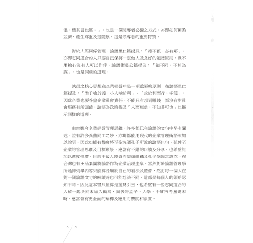明。希望讀者不僅可以體會論語中的孔子思想,同時也能加以推展到管理上的創造應用,以發揮「讀、想、用」之境界。
