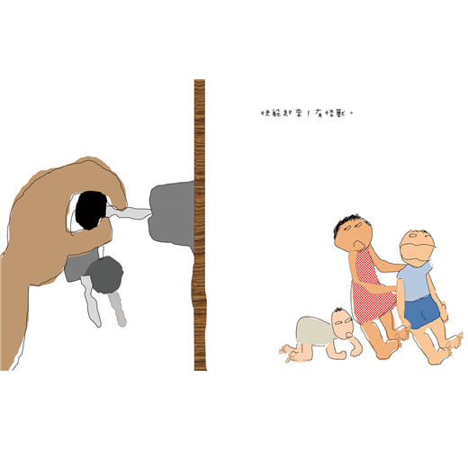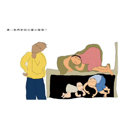 這過程中,有各種衝破耳膜的叫聲,也不絕於耳。常有突如奇來的慘叫聲、驚叫聲、又哭又笑的聲音、還有那種我不會形容的聲音……真的讓我覺得家裡有一隻大怪獸──不!還有三隻小野獸。還有野獸打起來的激烈場面,彷彿這裡只有我一個有理性的人類。我這理性人物,被他們視為不會和小孩玩的大人。