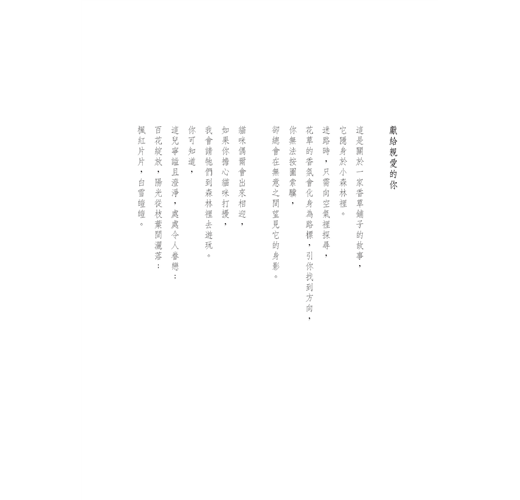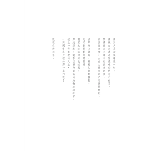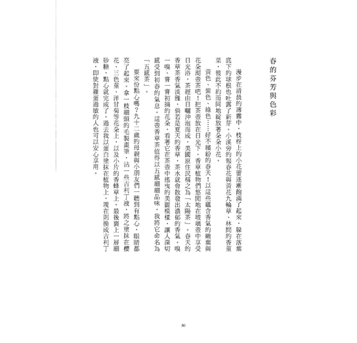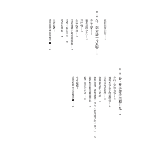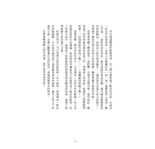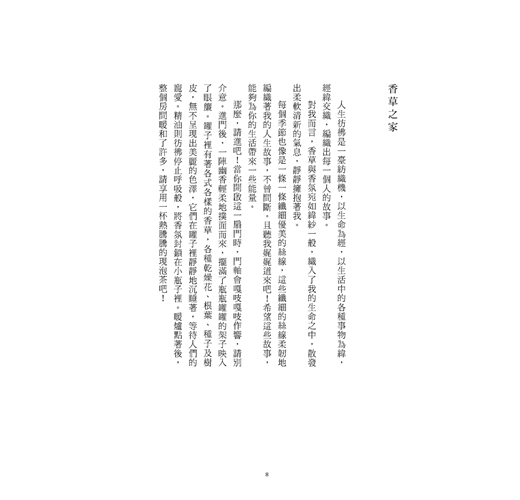 誠如作者而言:「香草與香氛宛如緯紗一般,織入了我的生命之中,散發出柔軟清新的氣息,靜靜擁抱著我。每個季節也像是一條一條纖細優美的絲線,這些纖細的絲線柔韌地編織著我的人生故事,不曾間斷。……」於此邀請你,翻開書頁細細咀嚼作者娓娓道來的花草故事,隨著文字與情緒想像著森林中四季更迭的自然景象,或許你也會開始樂意學習泡一壺花草茶,手植幾株香草,以花草作為撫慰身心的能量——請相信我,美好將不再只是遙遠的想像!