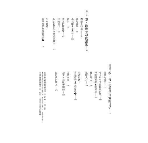 各種書籍、親自來訪的客人,以及蓼科(位於日本長野縣)的大自然都是我的生活導師,更迭的四季讓急性子的我學會了喘息的節奏,從工作與生活中,我領悟了香草植物的舒緩效果及精油的功效,發現了能夠鼓舞生命的微小力量。