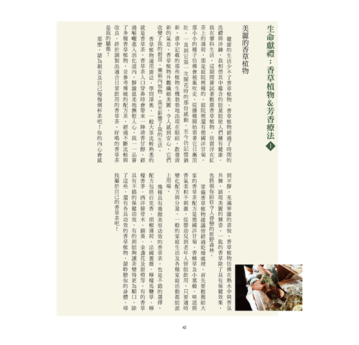 ★仔細地了說明許多香草與芳療的基本知識,對初入領域的人來說非常有幫助。作者還介紹了多種獨家配方,真是一本內容精彩的書!
