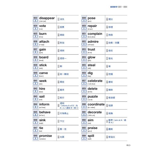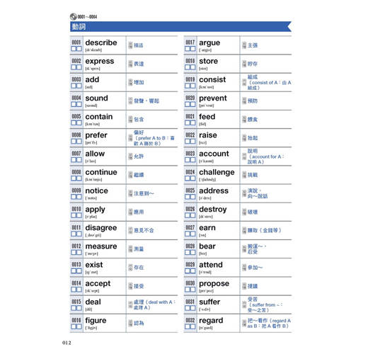本書附贈的MP3收錄所有單字的朗讀音檔,每個英文單字會配上中文翻譯,讓您可以掌握單字的發音與語意,同時訓練聽力與口說。
