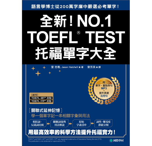 本書運用「應用語言學」及「語料庫語言學」的科學分析技術,從各類TOEFL托福相關資料中,整理出超過200萬個單字,再從此字庫中選出出題頻率高者,並進一步與現存較具權威的單字表資料做多次的相互比對,精選出學習者於TOEFL托福測驗中真正需要的單字。只要掌握這些單字,就已掌握測驗中95%常考單字。
