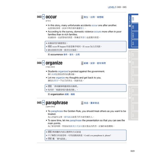 本書將TOEFL托福必備的單字分成4個級別難度:從基礎單字篇、Level1篇,再提升難度到Level2篇、Level3篇;每篇還很有系統地依「詞性」細分出動詞、副詞、形容詞與名詞,讓你在學TOEFL托福單字時就能比其他人更有邏輯、更有詞性概念。