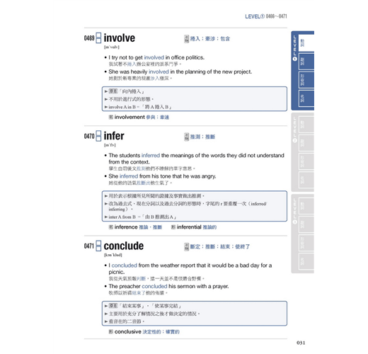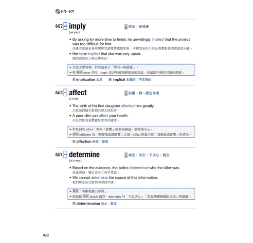 一般單字書只會告訴你「root = 根莖」「current = 現在的」這樣的概念,單字背誦的過程很容易單調、無趣,於是背過的單字很快就會忘得一乾二淨,問題就在於少了「關聯性的刺激」。本書除了列出單字的多種語意與例句之外,單字下方還整理了某些相關的說明,如「原意」「反義詞」「關聯詞」「相似詞」「同形詞(拼法一樣、意義不同的單字)」「衍生詞」或是其他解說等,讓你能藉由關聯性從各角度來深入了解單字,對大腦施加不同的刺激,以維持記憶續航力,同時還能「學一個單字記一串相關詞彙與用法」。例如: