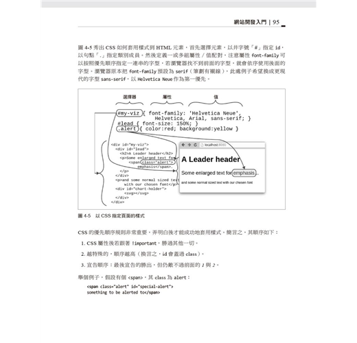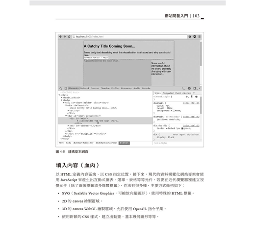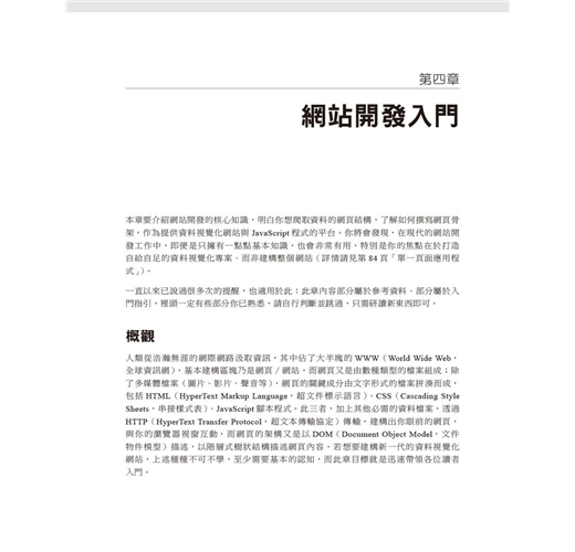 本書主要是介紹資料視覺化(data visualization,簡寫dataviz)工具鏈,在網際網路的時代,已經開始佔據主流地位;這套工具鏈的導引原則在於:你從手上資料挖掘出來的珍聞軼事,不論是何種有洞見的資訊,都值得在網路上擁有一個網站,供其他瀏覽器存取,既然能夠放在網站上,也就代表著你可以自由選擇如何散佈成果,可能只供少數幾人存取(使用認證機制或限定為區域網路),或是開放給全世界觀看,這是網際網路現身後,最為關鍵的要點,更是目前資料視覺化領域快速擁抱且支援的能力;這麼說來,資料視覺化領域的未來,一定會有JavaScript參...