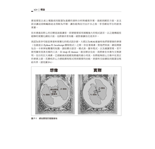 本書主要是介紹資料視覺化(data visualization,簡寫dataviz)工具鏈,在網際網路的時代,已經開始佔據主流地位;這套工具鏈的導引原則在於:你從手上資料挖掘出來的珍聞軼事,不論是何種有洞見的資訊,都值得在網路上擁有一個網站,供其他瀏覽器存取,既然能夠放在網站上,也就代表著你可以自由選擇如何散佈成果,可能只供少數幾人存取(使用認證機制或限定為區域網路),或是開放給全世界觀看,這是網際網路現身後,最為關鍵的要點,更是目前資料視覺化領域快速擁抱且支援的能力;這麼說來,資料視覺化領域的未來,一定會有JavaScript參與其中,因為JavaScript是網站瀏覽器上頭唯一的頭等程式語言;但是JavaScript尚未具備足夠的資料處理軟體疊層,無法精鍊原始資料,意思是說,想要從事資料視覺化工作的話,免不了要學會多種語言。我相信,資料視覺化工作在瀏覽器端雖以JavaScript為主,但仍需要另一支輔助語言,而自然而然地會讓人想到Python,也非Python莫屬,我希望本書能提供足夠的武器彈藥,幫各位讀者做好準備,應付各種資料視覺化專案。
