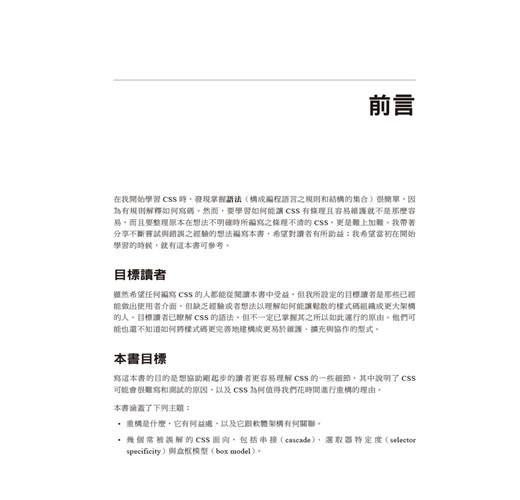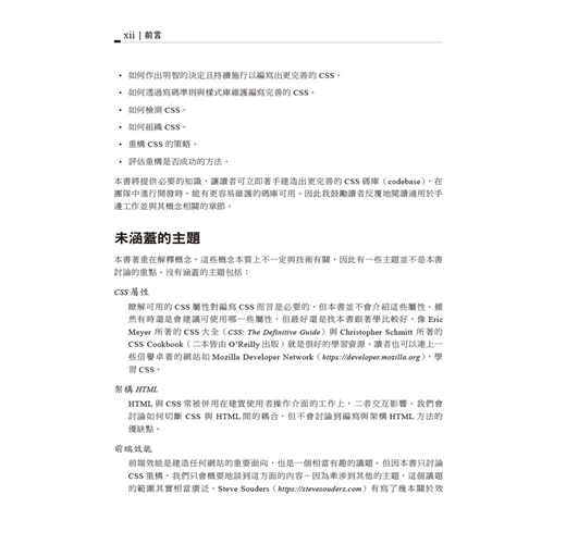 好的CSS是現代網站外觀與質感的基礎,與架構網站的HTML及運行程式的JavaScript同樣重要。不論你是才開始要執行第一個CSS專案或是要對現有的專案進行校調,本書延續一貫堅持優良架構的原則,提供您建造CSS碼庫的策略。