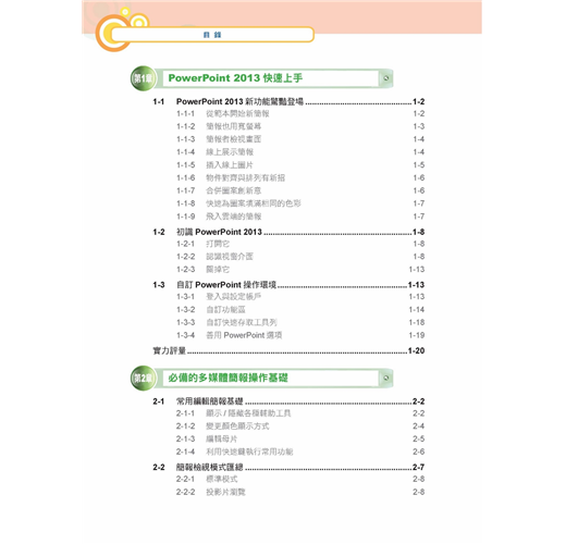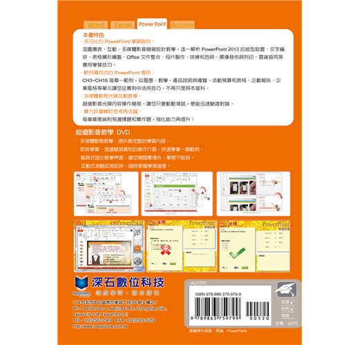 .多元化的PowerPoint學習面向: 涵蓋圖表、互動、多媒體影音簡報設計教學,逐一解析PowerPoint 2013 的版型設置、文字編排、表格圖形繪製、Office文件整合、母片製作、排練和放映、廣播發佈與列印、雲端協同等實用學習技巧。