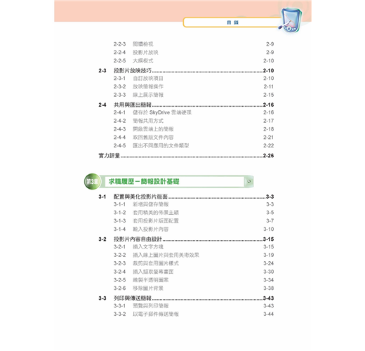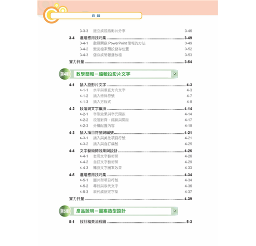 .範例導向式的PowerPoint應用: CH3~CH16每章一範例,從履歷、教學、產品說明與導覽、活動預算和表格、企劃報告、企業風格、等單元讓您從實例中活用技巧,不再只是照本宣科。