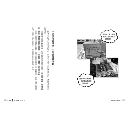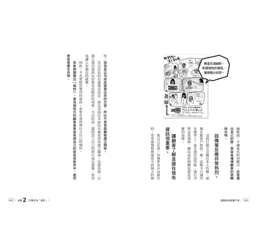 作者藤村先生舉了非常多社群行銷的案例,其中都是一些店家做生意的小巧思,轉換成對消費者有意義的文案或設計,持續性地跟顧客溝通所產生的效果。這本書點出大家的盲點,也就是社群媒體不該只是為了賣東西而推銷,應該要先建立關係。