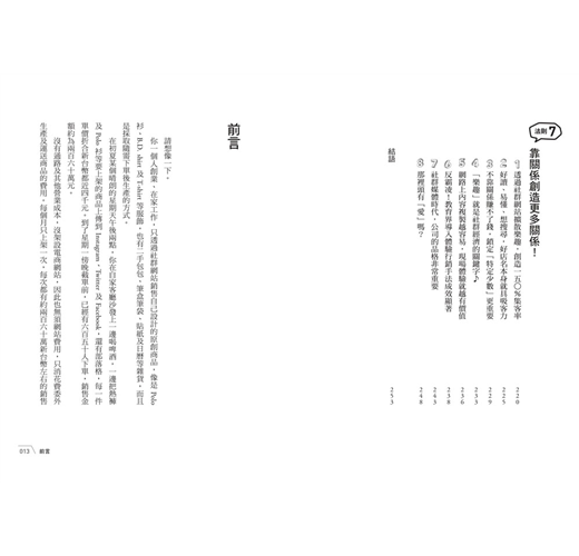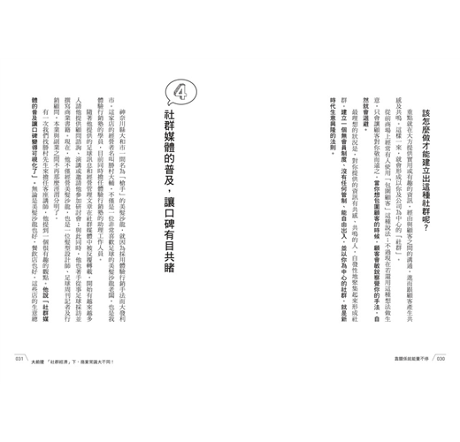 這一點若發展極致,未來我們將進入嶄新的時代;在新時代裡,我們都只會跟認識的人購買必要商品。當今社會隨處可見「社群經濟」出現的種種跡象。本書將提供大量實例與解說,請讀者務必細細體察新時代的脈動,實際應用到自己的事業上,好好表現一番。