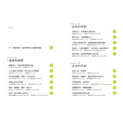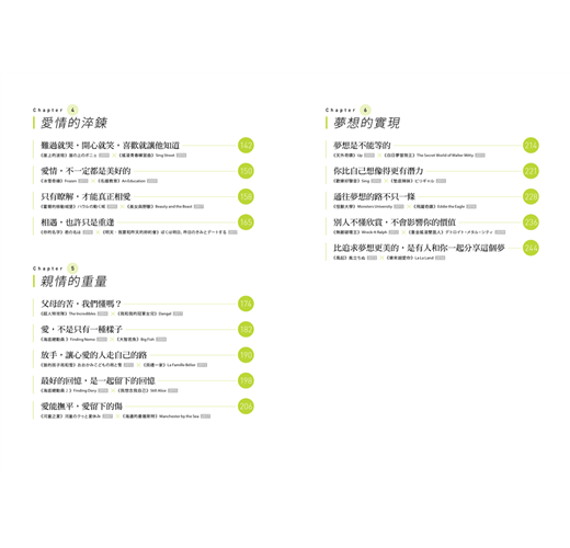 作者序/動畫電影,就是我們內心深處的船錨 CH1 成長的迷惘 ❖喚醒童心,重拾面對現實的勇氣 《小王子》Le Petit Prince‧2015✕《虎克船長》Hook‧1991 ❖大人是孩子的榜樣,孩子是大人的慰藉 《怪物的孩子》バケモノの子‧2015✕《終極追殺令》Léon‧1994 ❖童年時的經歷,塑造了今天的自己 《Colorful多彩奇幻之旅》カラフル‧2010✕《月光下的藍色男孩》Moonlight‧2017 ❖與過去的自己和解 《兒時的點點滴滴》おもひでぽろぽろ‧1991✕《我的少女時代》Our Times‧2015 ❖總有一滴眼淚,讓你一夜長大 《神隱少女》千と千尋の神隠し‧2001✕《浩劫奇蹟》The Impossible‧2013 ❖成長,最大的敵人是自己 《酷寶:魔弦傳說》Kubo and the Two Strings‧2016✕《哈利波特》Harry Potter Series‧2001-2011 CH2自我的理解 ❖定義自己,不要讓自己被定義 《海洋奇緣》Moana‧2017✕《鋼鐵人》The Iron Man Series‧2008-2010 ❖唯有自己,才能救贖自己 《回憶中的瑪妮》思い出のマーニー‧2014✕《鬥陣俱樂部》Fight Club‧1999 ❖了解自己想要什麼,是個複雜卻有趣的過程 《腦筋急轉彎》Inside Out‧2015✕《戀愛腦內高峰會》脳内ポイズンベリー‧2015 ❖如果有一天當你離開了,會不會有人感到悲傷? 《聲之形》聲の形‧2017✕《如果這世界貓消失了》世界から猫が消えたなら‧2016 ❖你的自我,也會影響到他人的自我 《跳躍吧!時空少女》時をかける少女‧2007✕《蝴蝶效應》The Butterfly Effect‧2004 CH3友情的珍貴 ❖沒有人是一座孤島 《史瑞克》The Little Shrek‧2001✕《非關男孩》About a Boy‧2002 ❖朋友像是一面鏡子,讓你看見真正的自己 《大英雄天團》Big Hero 6‧2014✕《高年級實習生》The Intern‧2015 ❖平等的友情,才能長久 《翡翠森林狼與羊》あらしのよるに‧2006✕《穿條紋衣的男孩》The Boy in the Striped Pajamas‧2008 ❖貼標籤容易,理解卻很難 《動物方城市》Zootopia‧2016✕《早餐俱樂部》The Breakfast Club‧1985 ❖不輕易放棄珍貴的友誼 《玩具總動員3》Toy Story 3‧2010✕《龍虎少年隊》Jump Street Series‧2012-2014 CH4愛情的淬鍊 ❖難過就哭,開心就笑,喜歡就讓他知道 《崖上的波妞》崖の上のポニョ‧2009✕《搖滾青春練習曲》Sing Street‧2016 ❖愛情,不一定都是美好的 《冰雪奇緣》Frozen‧2013✕《名媛教育》An Education‧2009 ❖只有瞭解,才能真正相愛 《霍爾的移動城堡》ハウルの動く城‧2005✕《美女與野獸》Beauty and the Beast‧2017 ❖相遇,也許只是重逢 《你的名字》君の名は‧2016✕《明天,我要和昨天的妳約會》ぼくは明日、昨日のきみとデートする‧2017 CH5親情的重量 ❖父母的苦,我們懂嗎? 《超人特攻隊》The Incredibles‧2004✕《我和我的冠軍女兒》Dangal‧2017 ❖愛,不是只有一種樣子 《海底總動員》Finding Nemo‧2003✕《大智若魚》Big Fish‧2004 ❖放手,讓心愛的人走自己的路 《狼的孩子雨和雪》おおかみこどもの雨と雪‧2012✕《貝禮一家》La Famille Bélier‧2015 ❖最好的回憶,是一起留下的回憶 《海底總動員2》Finding Dory‧2016✕《我想念我自己》Still Alice‧2015 ❖愛能撫平,愛留下的傷 《河童之夏》河童のクゥと夏休み‧2007✕《海邊的曼徹斯特》Manchester by the Sea‧2017 CH6夢想的實現 ❖夢想是不能等的 《天外奇蹟》Up‧2009✕《白日夢冒險王》The Secret World of Walter Mitty‧2013 ❖你比自己想像得更有潛力 《歡樂好聲音》Sing‧2016✕《墊底辣妹》ビリギャル‧2015 ❖通往夢想的路不只一條 《怪獸大學》Monsters University‧2013✕《飛躍奇蹟》Eddie the Eagle‧2016 ❖別人不懂欣賞,不會影響你的價值 《無敵破壞王》Wreck-It Ralph‧2012✕《重金搖滾雙面人》デトロイト・メタル・シティ‧2009 ❖比追求夢想更美的,是有人和你一起分享這個夢 《風起》風立ちぬ‧2013✕《樂來越愛你》La La Land‧2016 後記/