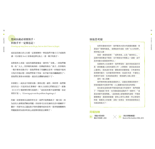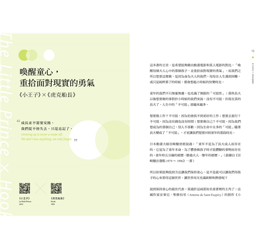 §喚醒童心,重拾面對現實的勇氣 《小王子》X《虎克船長》 ── 成長並不需要交換,我們從不曾失去,只是忘記了。 Growing up is never a trade off.We don’t lose anything, we only forget. 這本書的主旨,是希望能夠藉由動畫電影和真人電影的對比,「喚醒每個大人心中的那個孩子,並重拾面對現實的勇氣」。而我們之所以想要這麼做,是因為身為大人的我們,每每在人生遇到困難,或只是純粹累了的時候,都會想起小時候的快樂時光。 童年的我們不只無憂無慮,也充滿了無限的「可能性」;那些長大以後想要做的事對小時候的我們來說,沒有不可能。但現在真的長大了,人生中的「不可能」卻也越來越多。 想要換工作?不可能,因為怕會找不到更好的工作;想要去旅行?不可能,因為沒有錢也沒有時間;想要做自己?不可能,因為我們想成為的那個自己,別人不喜歡。因為生命中太多的「可能」隨著長大變成了「不可能」,才更讓我們想要回到童年的那段時光。 動畫大師宮崎駿曾經說過:「童年不是為了長大成人而存在的,它是為了童年本身、為了體會做孩子時才能體驗的事物而存在的。童年時五分鐘的經歷,勝過大人一整年的經歷。」(節錄自《宮崎駿出發點1979 ~ 1996》一書) 所以如果能夠找到方法讓我們保持童心,是不是就可以讓我們用孩子的心來看待這個世界,讓世界再次充滿新鮮和熱情呢? 說到保持童心的最佳代表,莫過於這兩部知名童書裡的同名主角了:法國作家安東尼・聖修伯里(Antoine Marie Jean-Baptiste Roger)的創作《小王子》(The Little Prince),以及蘇格蘭作家詹姆斯•馬修•貝瑞(James Matthew Barrie)筆下的《彼得潘》(Peter Pan)。這兩個角色也有許多不同的電影作品來一一詮釋,像是2015年的動畫電影《小王子》(The Little Prince),以及1991年由羅賓.威廉斯(Robin Williams)主演的《虎克船長》(Hook)。 小王子是個小男孩,他隻身居住在一個名叫B-612的小型行星上,在來到地球之前他曾經造訪過許多不同的星球,也見到了形形色色的大人:有貪心的商人、愛慕虛榮的人、也有酒鬼和國王。在他的眼中大人們是很奇怪的,總是會為了一些他不明白的事而煩惱。 彼得潘原本是一個不會長大的男孩,他住的地方叫做夢幻島(Neverland)。這是一個充滿了各種奇幻生物的美麗仙境。在《虎克船長》的故事裡,彼得潘離開了夢幻島之後回到了英國,開始過著和一般人一樣的人生。長大了的他娶妻生子,還成為了一個成功的律師。但他也忘記了當年發生在夢幻島的所有事情,也遺忘了自己曾經是彼得潘。 有時候會沮喪並不是因為世界變複雜了,而是因為你長大了。 The ever-changing world isn't always the reason behind your frustrations; sometimes it just means that you are growing up. 在孩子的眼中,這個世界是單純卻又美麗的,小王子也常常在不經意之間透露出獨特的世界觀。小王子覺得星星很美,因為「有一朵我們看不見的花」;他覺得沙漠很美,因為「在某個角落裡,藏著一口井」;他覺得他細心灌溉呵護的玫瑰花很美,因為她是「是全宇宙僅有的一朵玫瑰」。 後來小王子離開了B-612星球,在附近各個不同的星球上流浪。第一次遇到陌生人的小王子對什麼事都感到很新鮮好奇,但在和他們聊了一會之後卻感到很不開心,因為他們總是在意著一些他不理解的事,也不禁讓他開始懷疑,自己在乎的東西,真的有想像中那麼重要嗎? 其中,對他最大的打擊,是當他來到地球後看到了一叢玫瑰花的時候。她的玫瑰曾經告訴小王子,她是全宇宙唯一的一朵玫瑰花,也因為如此,即便玫瑰帶刺又善變,小王子還是願意盡心盡力地去照顧她。但如今光是這座花園裡就有幾千朵和她一樣美麗、一樣帶刺的玫瑰,叫他怎麼能不難過呢。 「我以為我很富有,擁有世上唯一的一朵玫瑰花,可是,原來不過是一朵最平常的花罷了。」小王子趴在草地上,哭著這麼說。 但是在好友狐狸的開導之下,小王子明白了,他的那朵玫瑰之所以能夠盛開,正是因為有他的關愛而使這朵玫瑰有別於其他的玫瑰。所以即便世上有許多玫瑰,但在小王子心中她永遠是獨一無二。 改變並不可怕,可怕的是變成了一個你自己不喜歡的人。 Change isn't so bad, as long as you don't become someone that you dispise. 曾經許願一輩子不想長大的彼得潘,在《虎克船長》的故事中離開了夢幻島回到了英國,在溫蒂(Wendy)的幫忙下找到了願意收養他的父母,也開始像其他人一樣長大;隨著時間,他漸漸忘記了夢幻島,也不記得自己原本是誰。現在他是個成功的律師,但總是忙於工作,和兩個孩子之間的關係也越來越疏遠。 為了營救被虎克船長抓走的兒子,彼得跟著小仙女叮噹(Tinker Bell,茱莉亞.羅伯茲飾)回到了夢幻島,尋求當年他的夥伴「失落男孩」們(The Lost Boys)的幫助。但失去童年記憶的彼得不只不會飛,還成為了失落男孩們心中最討厭的「大人」,毫無想像力、嚴肅又無趣。不只如此,男孩們也不能諒解當年彼得的離去,害得他們從此受到虎克船長的威脅。 所謂珍惜,就是不讓生命中重要的事,在生活中輕易被忽略。 Cherishing is about not allowing the important things in life get neglected as we are busy living it. 另一方面,彼得被綁架的兒子傑克(Jack)在虎克刻意的親近之下,竟然開始覺得虎克比彼得更像個爸爸。看到這樣,彼得才驚覺自己因為忙著生活,讓生命中最重要的事情被忽略了,自己也變成了以前所對抗的大人,於是他決定要改變,找回失去的童