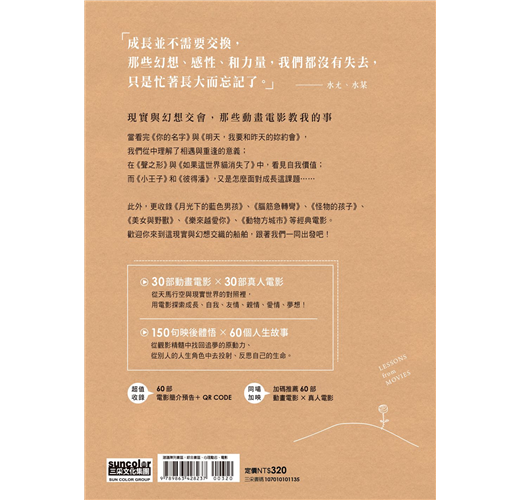 動畫電影,就是我們內心深處的船錨 從2012年成立「那些電影教我的事」以來,與讀者們的互動中我們發現,讀者和我們共同遇到的人生難題,就是「失去勇氣」:面對現實世界的挑戰時,我們失去了初衷、迷失在各種期待裡;甚或是面對各種人際關係的拉扯,不管是愛情、親情或友情,我們搖擺不定。 於是我們變得世故又憤世嫉俗;甚至漸漸地誤以為外在的期待,就是我們內心的聲音,最後在隨波逐流的過程中迷失了方向,也失去了信心。 有一次,我們在日本動畫大師宮崎駿的著作《折返點》裡面看到他說:「對於那些一旦面對現實就失去信心的人來說,首要應該是重新找回『幻想的力量』」。 這句話無異於一記當頭棒喝,原來我們一直都握著這個答案,只是一時忘記了──能讓我們找回幻想的力量的,不就是童年時的自己嗎? 當我們還是孩子的時候,總是充滿了想像力;給孩子一張白紙或一盒積木,就可以創造出一個奇想天地。就算是一群彼此陌生的孩子,還是可以瞬間打成一片。獨自一人時,仍然有辦法在腦海中召喚出一群玩伴來遊戲。 而幻想的力量之所以重要,是因為它讓一切都變成了「可能」──在想像的世界裡,動物會說話、城堡會走路、夢想也全部都能實現。可惜的是隨著年紀漸長,還能夠提醒我們保持童心的東西所剩無幾。 還好,我們還有動畫電影。 在動畫電影的世界裡,我們可以不受現實的限制,找回心中的那份童真、傾聽內心的聲音,進而用全新的觀點來看待事物。 不管是西洋的迪士尼(Disney)、皮克斯(Pixar)或是東洋的吉卜力(Ghibli),不只我們看得津津有味,每次有機會介紹動畫電影時,讀者們的反應也都很熱烈,也讓我們萌生了撰寫這本書念頭。 但我們也明白,如果只是一味地逃避現實,沈溺在幻想的世界中尋找慰藉,畢竟不切實際。就好比《白日夢冒險王》(The Secret World of Walter Mitty)電影中的男主角最後也領悟到,再美的夢,還是需要腳踏實地才能實現。再者,往往真人電影與動畫電影想要溝通的訊息是一致的,主要的差別在於傳達的方式不盡相同。所以觀者的感受也大相逕庭。 於是我們另外挑選了30部真人電影,將他們和30部動畫電影去做對比,目的就是希望讀者們在幻想的世界中修補受傷的心靈之後,帶著找回的勇氣重新回到這個世界,去面對現實的挑戰。 而在寫這本書的過程中我們也體悟到,「成長不需要用童年去交換」才能擁有面對現實的勇氣。重點在於如何在現實與幻想中找到平衡,讓我們在現實中打滾掙扎的同時,也不要忘了初衷。 如果我們可以守護著像孩子一樣的心,那麼不管這個世界有多麽殘酷,我們還是能夠找到繼續前進的動力。 若真人電影是我們在現實遠方的燈塔,那麼動畫就是內心深處的船錨。 歡迎你來到這現實與幻想交織的船舶,一起出發吧!