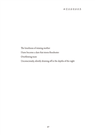 當年與詩相遇就在春季,短暫的煙花詩情也曾在無聲無息的盛夏裡耗盡,眼看深冬雪鄉已在不遠處等待,於是,詩人便把自己淡淡地遺忘在這秋色猛燃的季節,雙語詩集《忘秋 Forgetting Autumn》翩然降生。