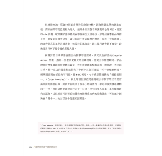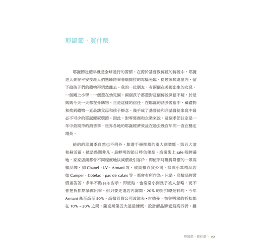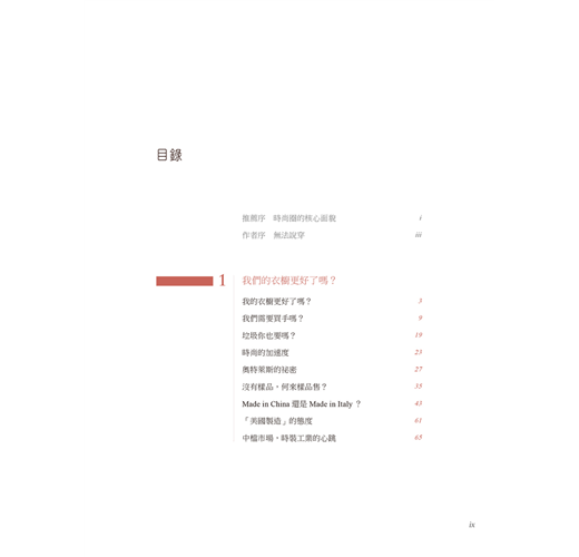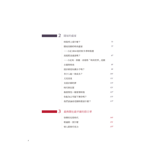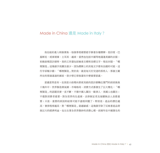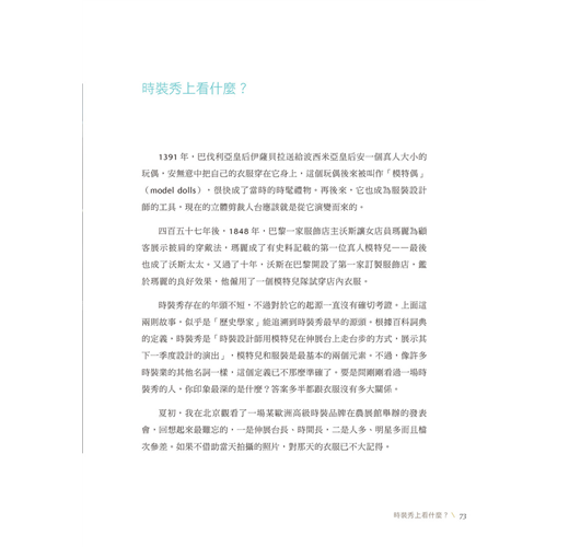 從前的春夏與秋冬兩季服裝系列,衍生到如今一年到尾不間斷的系列推出,速食時尚的現象讓設計師們疲於奔命已是不爭的現實;而過去設計師注重的美學與質感在現行時尚界的潛規則驅使下,勢必只能另尋新機開創展望,關於時尚從過去到現在的變異以及作者置身於時尚中心所觀察到的真實一面,文中提出的看法精闢地描繪出了時尚圈的面貌;另外對於想要跨入時尚設計產業、又或是希望能有扎實認識的朋友,作者更特別在書末開闢空間一一回答你心中的疑問。