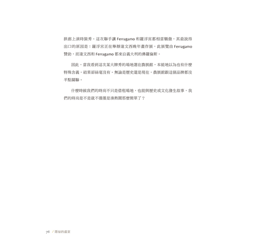 同樣身為時尚工作者,對於產業的熱愛與堅持特別感同深處,我想,透過作者一層層抽絲剝繭的細膩文字表現,這份真誠的愛能掀起更多的了解共鳴。