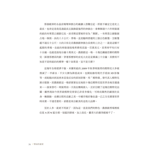 那個縱深的水晶宮璀璨伸展台的確讓人很難忘記,即使不確定它是史上最長,也肯定是我見過最長且裝飾最強烈的伸展台。拿舉辦過十六年時裝週的紐約布萊恩公園跟它比,前者簡直要被形容為「簡陋」。布萊恩公園整個占地一條街、長約八十公尺,秀場一直是臨時搭建的三張白色帳篷,主帳篷超不過五十公尺,大約只有北京農展館伸展台長度的三分之一。就是這樣不起眼的秀場,在紐約時裝週每場秀費用高達一百萬美元,而秀時平均只有十分鐘,也就是說每分鐘十萬美元。農展館這一場,十幾位纖細若柳的模特兒,踩著那麼高的跟,穿著那麼厚的皮毛大衣足足撐滿三十分鐘,其費用不知是不是和紐約的標準一樣?如果是,豈不是天價?