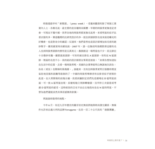 幾年前我曾經在作者的另一本著作《內衣秀》的序中寫道:「看她的故事,就像是看『慾望城市』的凱莉十多年前第一次搭地鐵到大蘋果,接著逐漸成為知名專欄作家的劇情一樣有趣。」當時書中的內容主要描述作者在紐約時尚設計學院求學的親身經驗、內衣設計學習路程以及進入紐約時裝工業的各式經歷,而這一回作者則是以一個紐約設計師的角度來談談她眼中的「時尚」。