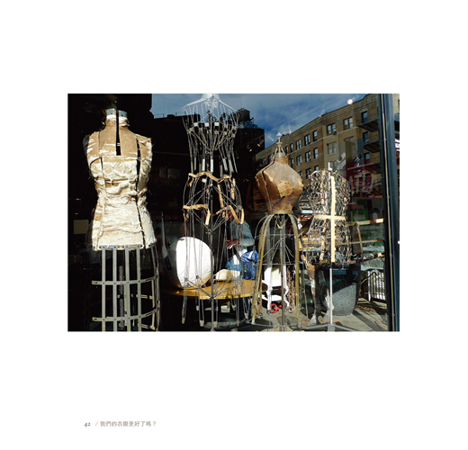 時裝週期間,我正好逛到DKNY蘇活分店。一名女店員正用電腦播放白天上演的DKNY大秀。她突然大叫:「終於可以秀紋身了!」聽到我的疑惑,她忙解釋說,你不知道,以前DKNY的伸展台上是絕不能出現紋身的,店員身上的紋身也不允許暴露。她自己兩條小臂上都有紋身,因此夏天不管多熱,都必須穿長袖。她想今年夏天她可以解放了。這也算是紐約的時尚吧。看似漫不經心,其實每個人都在悄悄關心著時尚跟自己的關係。