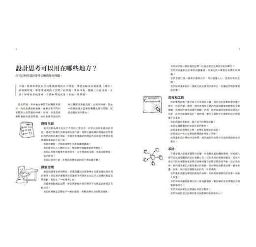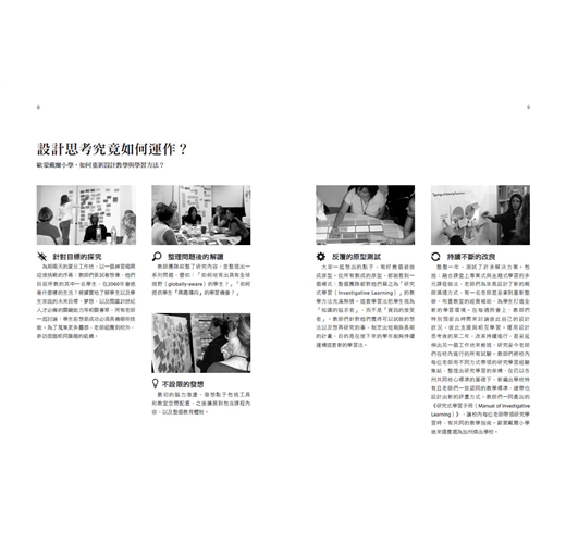 為了讓這股「魔力」,能以更「接地氣」的方式幫助教育工作者,我們特別向IDEO爭取授權,首度將他們與學校合作產出的「教育工作者的設計思考實踐手冊」,以繁體中文形式介紹給台灣讀者;也特別邀請國內兩個推動設計思考不遺餘力的組織,台大創新設計學院與Design for Change(DFC)團隊,各自以近萬字的篇幅,分享團隊將設計思考帶入教學現場的精華方法。