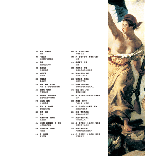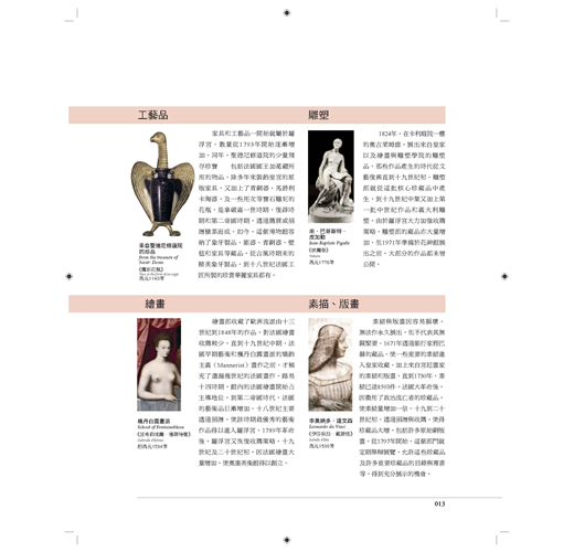 羅浮宮博物館畫冊分人體雕塑與平面繪畫部分:雕塑作品著重在如近東藝術、希臘、埃及及羅馬等遠古時代的神話及歷史故事人物;繪畫部分則著重在宗教性及人物肖像的闡述等,作者以故事背景作為描述重點,再以學術角度解讀畫作,讓讀者除了進一步了解藝術品本身外,也能得知羅浮宮收藏這些藝術品的曲折過程。