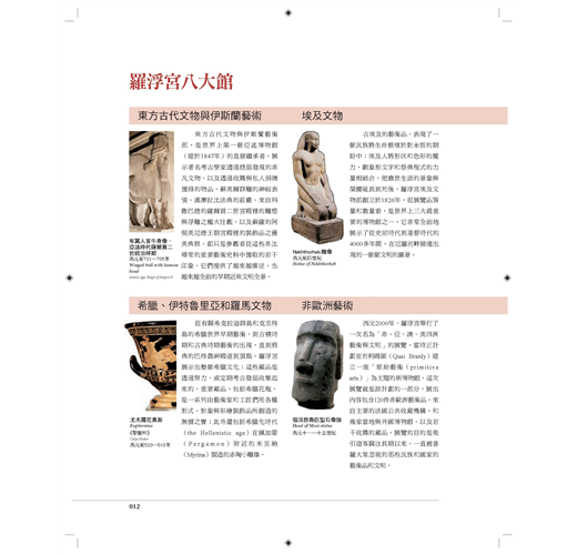 擁有八個收藏展示部門的羅浮宮,有橫跨世界各個藝術體系的典藏品,從遠古藝術與東方藝術、埃及與古希臘藝術、古羅馬與宗教藝術等,其歷史背景與文化特徵都是本書的敘述重點,介紹各個人類文明發展的歷程,也介紹作品的歷史與輾轉收藏故事。