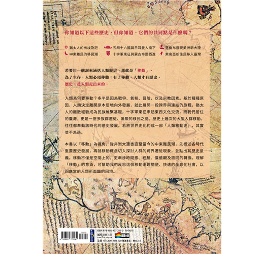 「移動」的概念是重要的。臺灣本就是座多族群遷徙、匯聚的「移民之島」,而歷史上幾次大型的人群移動,往往都牽動了該時代的發展。這樣說來,若將世界史化約成一部「人類移動史」,其實並不為過。