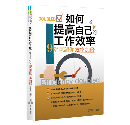名人推薦:本書從提升效率的角度出發,用九章的篇幅多元化地闡述了提升工作效率的工作方式。在各個方面的闡述中,本書以心理學原理為指導,以眾多管理名家的先進理念為依託,希望能夠為眾多因工作效率不高而苦惱的讀者提供一個科學理想的工作模式,提高工作效率,更好更快樂地工作。