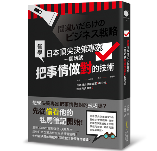 本書作者山田修不僅是在本書中分享他對各大企業決策的看法與評估,也深入分析企業在決策時可能有的過程與考量。不管這樣的過程與考量最後締造出來的是讓企業落入泥淖的決策,或是讓企業起死回生的重要決定,也都能夠成為我們在職場上進行判斷、或在經營企業、創業、自營產業決策時的重要參考。如何吸取這些企業透過實際驗證而得來的經驗,也將是我們提升自我能力的重要關鍵。