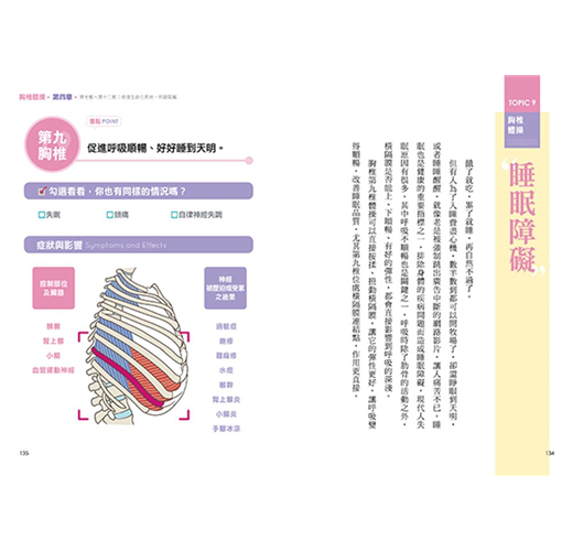 胸椎會影響,從呼吸系統、神經系統、消化系統、新陳代謝系統、生殖系統,因此許多檢查不出病因的呼吸順、失眠、拉肚子、恐慌、膏肓穴痛、五十肩、長期疲勞,到底是哪一椎引發的,讀者都可以從表單上,自己輕易判斷出來。