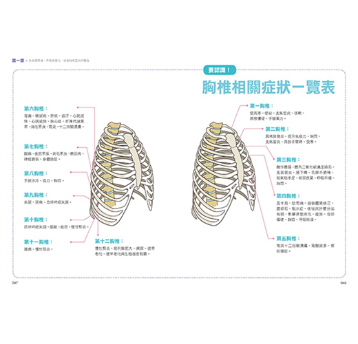 •以系統性的「病徵」分類,列出胸椎各椎會引發的相關身體問題