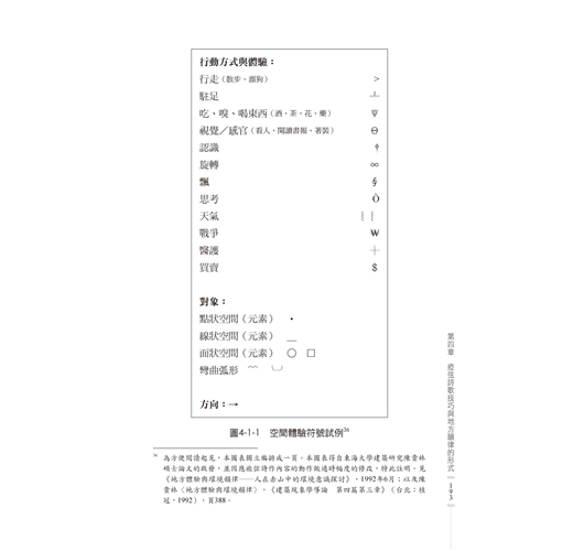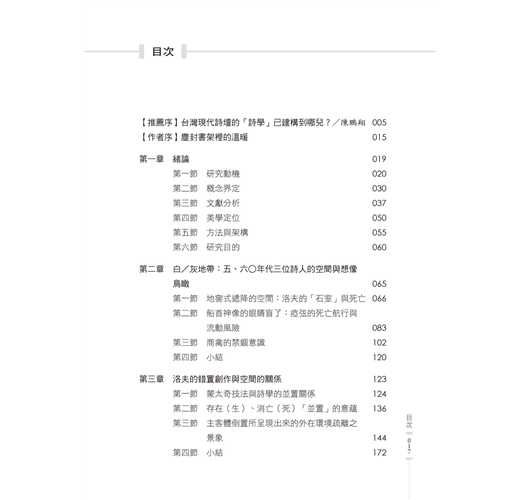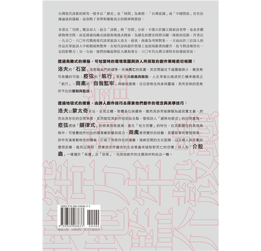 本書以「空間」概念切入,結合「詩歌」與「空間」分析,不僅只於獨立探索詩美學,也並非鑽研物理空間,而是透過鳥瞰式掃描和地毯式搜索,為僵化的歷史時間另闢一條新的思路。作者以一九五○、六○年代戰後現代詩軍旅詩人洛夫、瘂弦、商禽為考察對象,一方面由於三位詩人的作品在軍旅詩人中較精純與整齊,在現代詩的創作質量上也展現顯著的躍升,迄今對詩壇仍有一定的影響力;另一方面,他們的崛起與壯大應和著五、六○年代台灣文壇特有的發展景況。