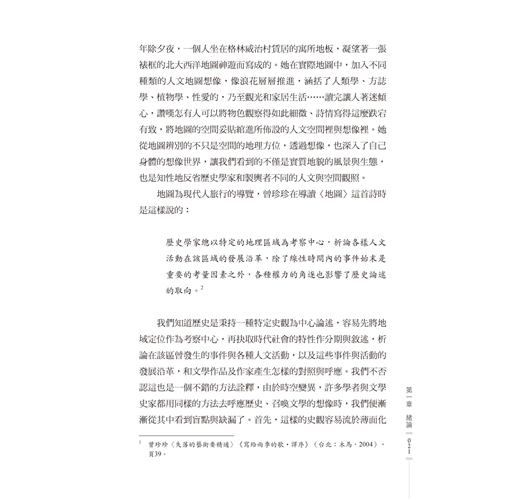 我們知道歷史是秉持一種特定史觀為中心論述,容易先將地域定位作為考察中心,再抉取時代社會的特性作分期與敘述,析論在該區曾發生的事件與各種人文活動,以及這些事件與活動的發展沿革,和文學作品及作家產生怎樣的對照與呼應。我們不否認這也是一個不錯的方法詮釋,由於時空變異,許多學者與文學史家都用同樣的方法去呼應歷史、召喚文學的想像時,我們便漸漸從其中看到盲點與缺漏了。首先,這樣的史觀容易流於薄面化與簡捷化,敘述觀點太單一,表像的洞見之後隱藏著選擇性的有所不見,讓原本就不存在的不偏不倚之客觀,變得更偏倚;它忽略了時間有其延展性,也忽略了時代的演變跟作家的思潮推進有極大關係,而非僅僅來自政治的層面。