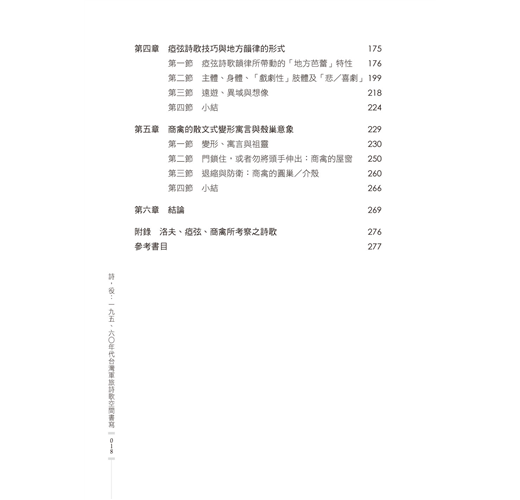 初讀洛夫、瘂弦與商禽的詩,乃在青蒼少年時代,那時似懂非懂亦不求甚解,一種難以言喻的淡淡迷戀與迷惘;如今,回顧那段書寫的的日子,終日與其為伍,不斷在他們詩行中徘徊、遊蕩,時而搔首時而蹙眉,最後卻落得書硯「狼藉」,好幾回都在書桌前趴睡去,自己彷佛也成了他們詩中一個苦澀的身影。但是,這絕對是值得的,他們帶給我創作的養份,以及從研究中所得到的收穫,亦不是外人所能體會的!