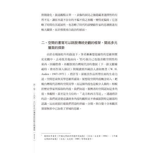 台灣現代詩歌的研究一般多以「歷史」及「時間」為參照,