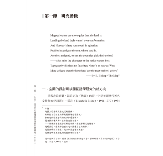 由於在楊師松年的啟迪下,筆者漸漸想從線性的思維與歷史史觀中,去尋找其他面向,[3]恰巧我自己也很喜歡空間性的東西,因緣際會,再觀察到台灣現代詩的發展(下一節文獻檢視時,會再作深入探討)與閱讀到外國詩人諸如奧登(W. H. Auden,1907-1973)、碧許等,深被其作品所帶出來的生命力道、空間思索與美學思維所感染,便想從空間角度概念切入,耙梳台灣現代詩裡的空間美學,而這個角度也是較少人做的。相較於歷史學家所採取的角度,我們知道,製輿者的空間認知是多角度、多觀照、甚至是全方位的。「北方和西方等近」,透過碧許的詩,我們更清楚意識到多角度的觀照並不會減損對特定細部的認識,反而更能打破我們習設的界線、分期,與自覺十分客觀其實卻無形中已加重了界域的思維。