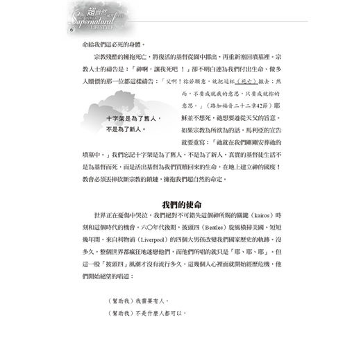 十字架在歷史上所成就的完全啟示是如此的充滿能力,凡經歷過的人都會離 開捆綁之地,走向「恩典之地」的大門。他們離開舊有死亡和絕望的領域,進入 憐憫和盼望的新世界。那些成功離開舊思想模式、開始活在全新事實的人,就是 那些明白舊約事奉和新約超自然事奉兩者截然不同的人。雖然兩約的事奉都有神 聖能力的彰顯,但這些彰顯背後的主要目的卻截然不同。