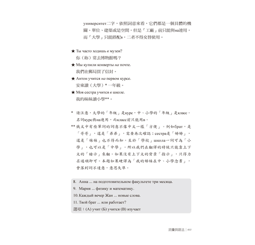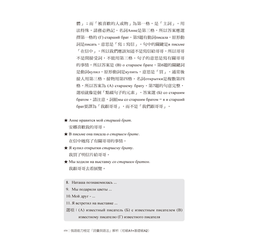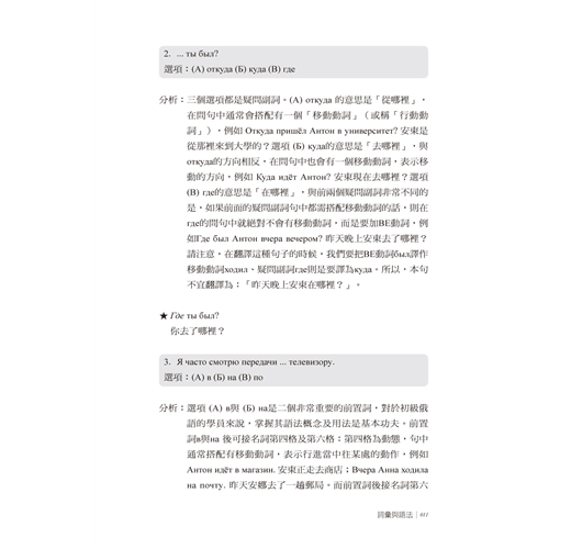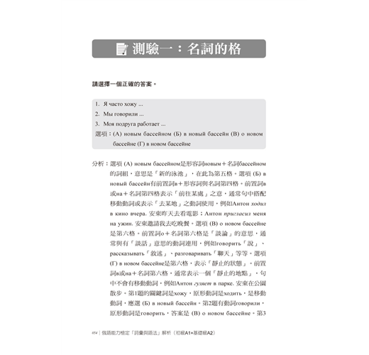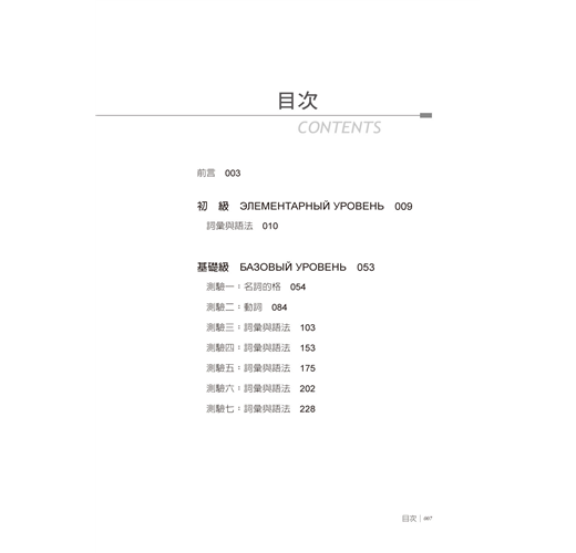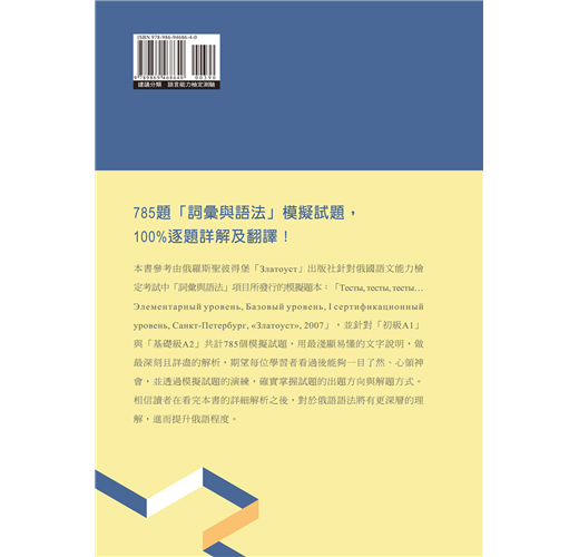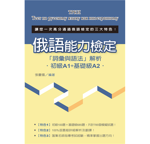 俄國語文能力測驗的各級考試皆為5項測驗項目,分別是「詞彙與語法」、「閱讀」、「聽力」、「寫作」及「口說」。本書參考由俄羅斯聖彼得堡「Златоуст」出版社針對「初級」與「基礎級」的「詞彙與語法」測驗所發行的模擬題本:「Тесты, тесты, тесты… Элементарный уровень, Базовый уровень, I сертификационный уровень, Санкт-Петербург, «Златоуст», 2007」,經該出版社授權,針對「初級」的100題與「基礎級」的685題,共計785個模擬試題,用最淺顯易懂的文字說明,做最深刻且詳盡的解析,期望每位學習者看過後能夠一目了然、心領神會,透過模擬試題的演練,確實掌握試題的出題方向與解題方式。此外,對於就算暫時還不想報考的學習者,看過本書的詳細解答之後,相信對於俄語語法將有更深層的理解,並提升俄語程度。