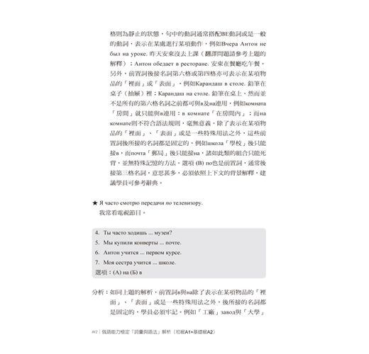 本書經由俄羅斯聖彼得堡「Златоуст」出版社正式授權針對俄國語文能力檢定考試「詞彙與語法」的模擬題本:「Тесты, тесты, тесты… Элементарный уровень, Базовый уровень, I сертификационный уровень, Санкт-Петербург, «Златоуст», 2007」,並由編者鎖定「初級A1」與「基礎級A2」共計785個模擬試題,以最淺顯易懂的文字說明,做最深刻且詳盡的解析,期望每位學習者看過後能夠一目了然、心領神會,透過模擬試題的演練,確實掌握試題的出題方向與解題方式。相信讀者在看完本書的詳細解析之後,對於俄語語法將有更深層的理解,進而提升俄語程度。