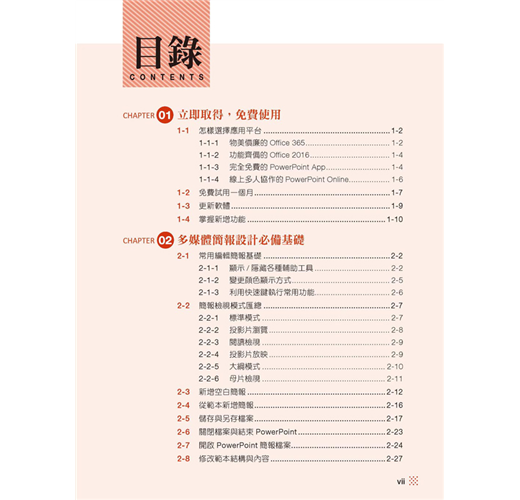 本書共分十六章,於第一章掌握並取得免費試用的PowerPoint 應用軟體後,第二章即能立即掌握與使用PowerPoint 2016 完成基本簡報設計與應用,第三章則直接帶大家進入雲端應用的領域,不僅能在電腦、筆電上使用,亦能在各作業平台及iPad 等行動裝置上,與多人一同在線上完成協同作業。在具備了使用基礎並擴大了應用範疇之後,藉由第四章至第十六章以一章一例的案例教學,更深、更廣的學會各種應用方法與技巧,滿足在各種時機與場合的需要,潛移默化的成為多媒體簡報應用高手,輕易滿足演講式、互動導覽式、自動放映展示式、線上廣播放映式等等影音多媒體簡報需求。