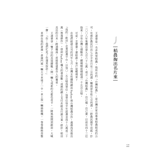 台灣的讀者往往習慣以仰望的角度關注美國、歐洲或日本的經驗,然而,本書卻以扎實的採訪與清晰的筆觸,從另一個平行演化的空間,帶領我們觀察自己的社會。相信是關心台灣農業未來的您,不容錯過的好書。——賴青松(穀東俱樂部創辦人)