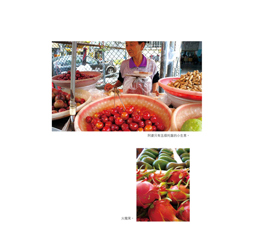 文字,是作家想說的話,不識作家不打緊,有文字就已足夠,有時候還會溢出喉頭讓人非得靜下來消化不可。像是專業農民劉勝雄,在他人眼中是「專門種有機的」,可是在綠妖心裡,七十多歲的劉勝雄,雄心勃勃老而彌堅。他的園子是裝置藝術,有掛小黃瓜的麻繩網,有支撐番茄、辣椒的細網,還有防蟲、防鳥用的天羅。無論看來多麼繁複,這些網繩被劉勝雄一拎一抖,一律立刻就位。綠妖說得精準,「這裡像黃藥師的陣。」