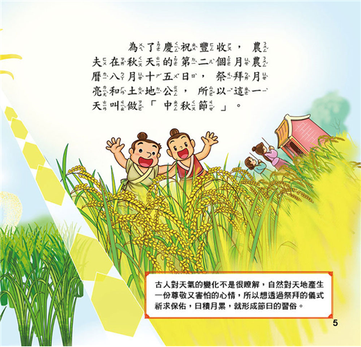 4. 共築親子記憶:當家長陪伴孩子閱讀《中秋節》的時候,一起享受故事的生動描述、彩色插畫的畫龍點睛、習俗活動的精彩演變、童詩的念讀喜樂、節日遊戲的輕鬆操作,可以把家長童年的過節記憶,和孩子分享,共同體悟一個獨特又屬於你們的中秋節習俗。